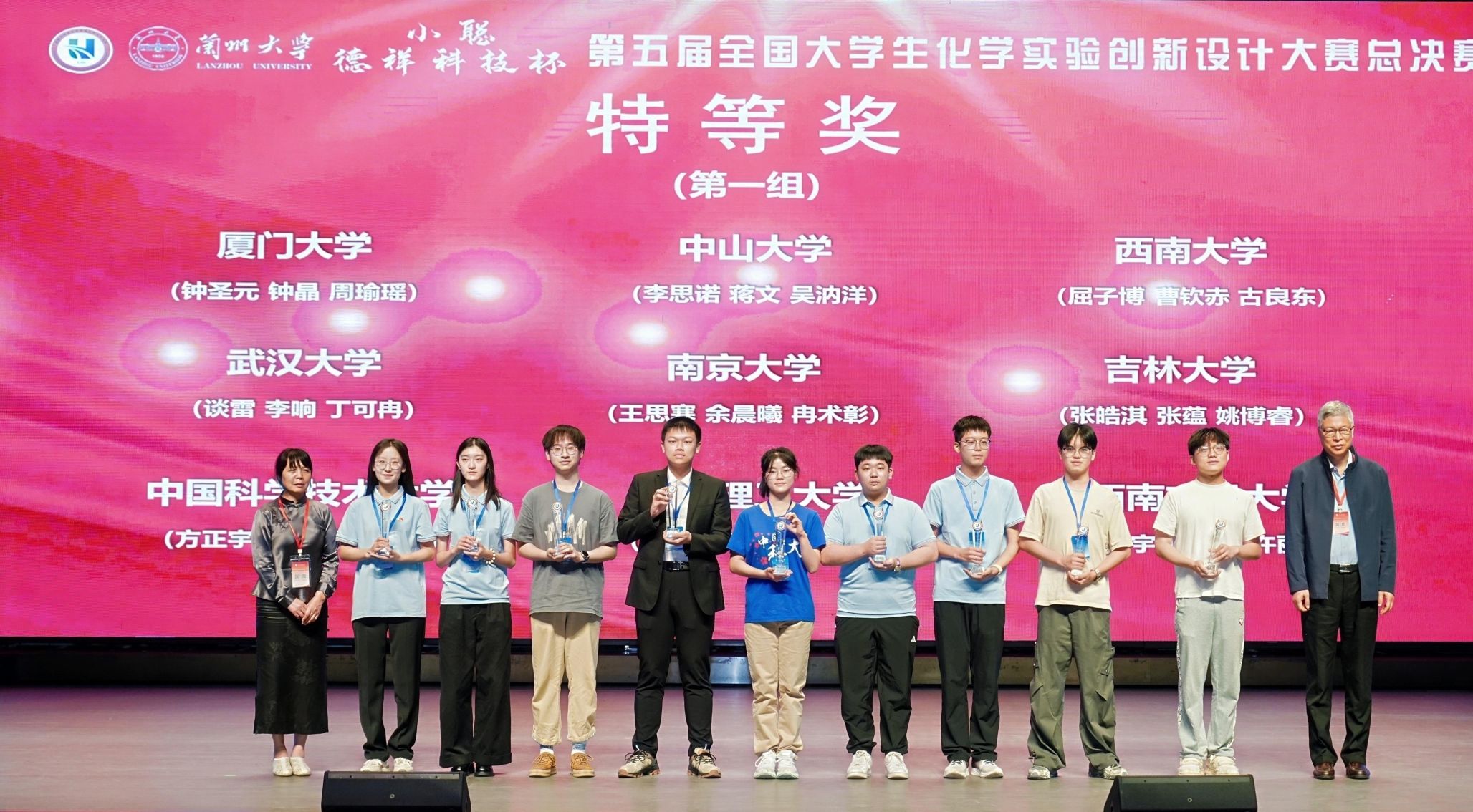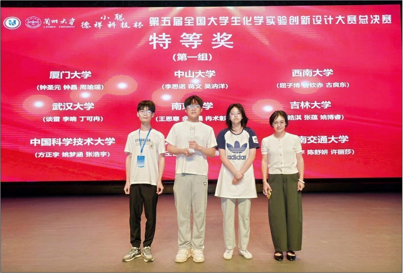 2025年8月21至24日,“小聪-德祥科技杯”第五届全国大学生化学实验创新设计大赛总决赛在兰州大学成功举行。我院谈雷、李响、丁可冉三位同学组成的代表队在总决赛中获得特等奖。龚林波和赵发琼老师为该参赛队伍的指导老师。