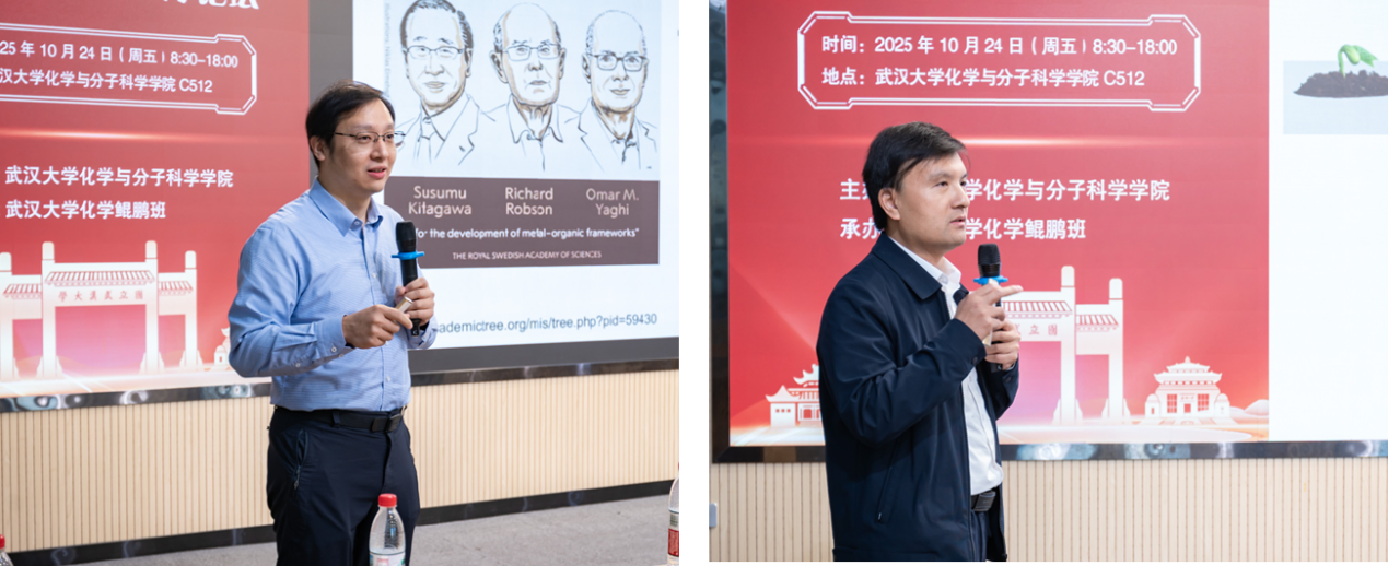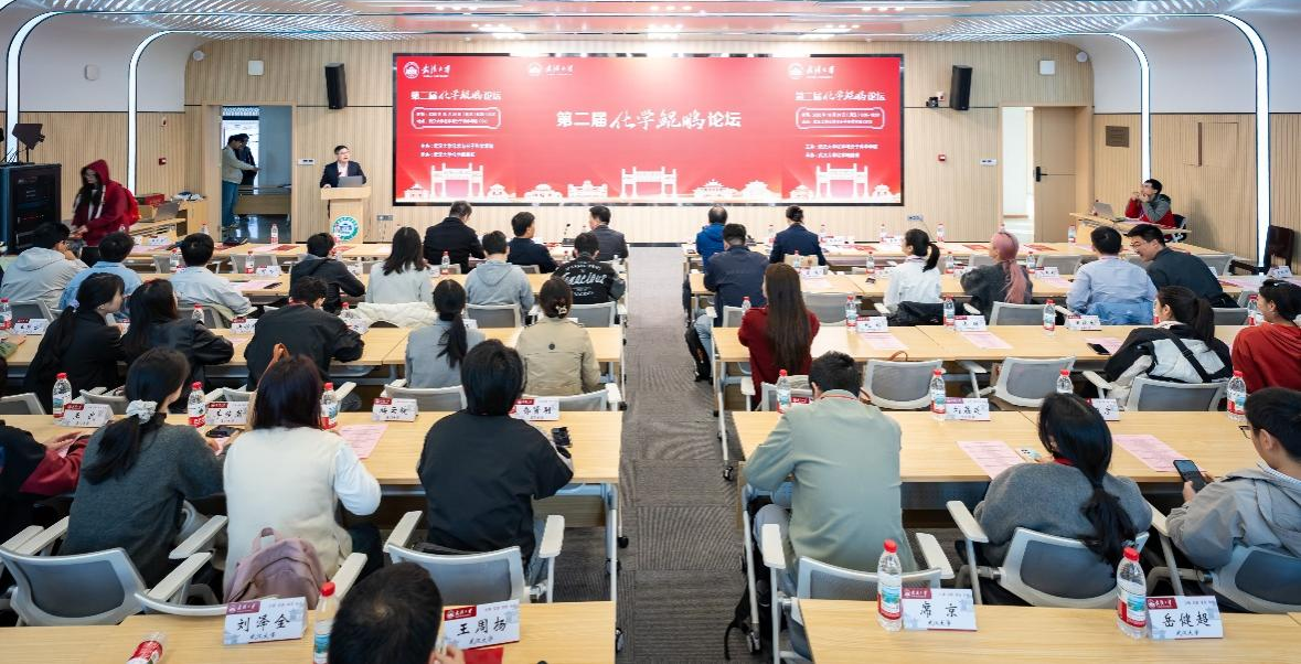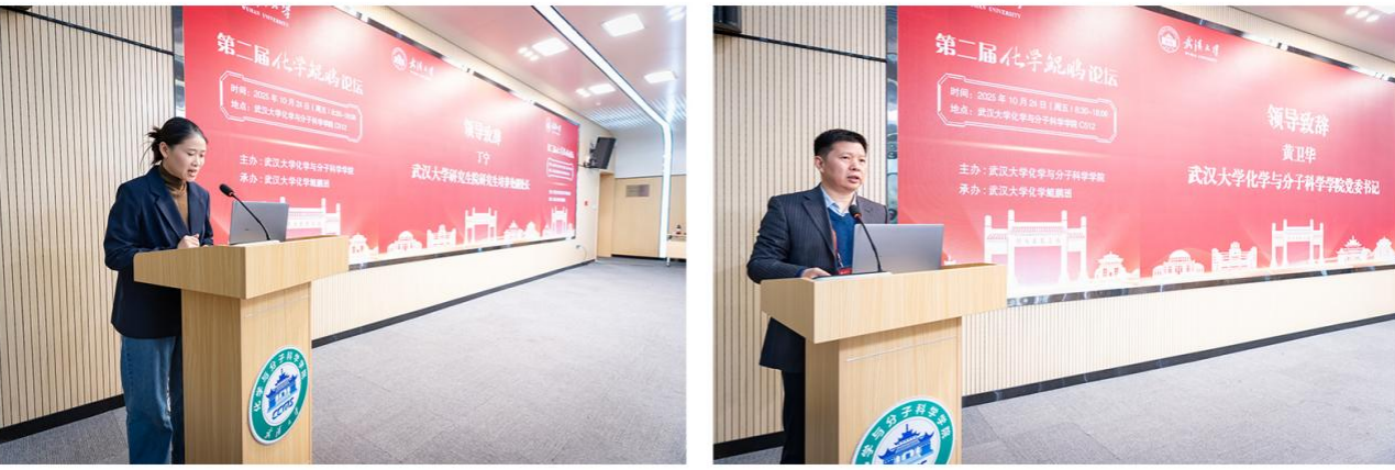 为深入贯彻落实党的二十大和二十届历次全会精神,全面提高人才自主培养质量,展示拔尖创新人才培养成效,搭建博士生学术交流平台,由武汉大学化学与分子科学学院主办、化学鲲鹏班承办的第二届化学鲲鹏论坛于2025年10月24日顺利召开。中国科学院大连化学物理研究所副所长王峰研究员、武汉大学国际交流部部长邓鹤翔教授、研究生院研究生培养处副处长丁宁、化学与分子科学学院党委书记黄卫华教授、副院长刘文博教授,以及来自北京大学、清华大学、中国科学技术大学、南开大学、南京大学、厦门大学、复旦大学、上海交通大学、吉林大学、浙江大学、中山大学、湖南大学、四川大学、华中科技大学、武汉大学等高校的100余名博士生参加论坛。开幕式、特邀报告和闭幕式由副院长蒋风雷教授主持,学生报告环节由魏振威教授、戚孝天教授、宋智平教授主持。